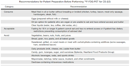 - Purpose: Metabolic preparation prior to the PET scan performed to identify inflammatory pathology of the heart, including cardiac sarcoidosis and cardiac infections, is very important. The aim of this diet is to suppress normal glucose usage by the heart muscle and force it to rather use energy from fat.